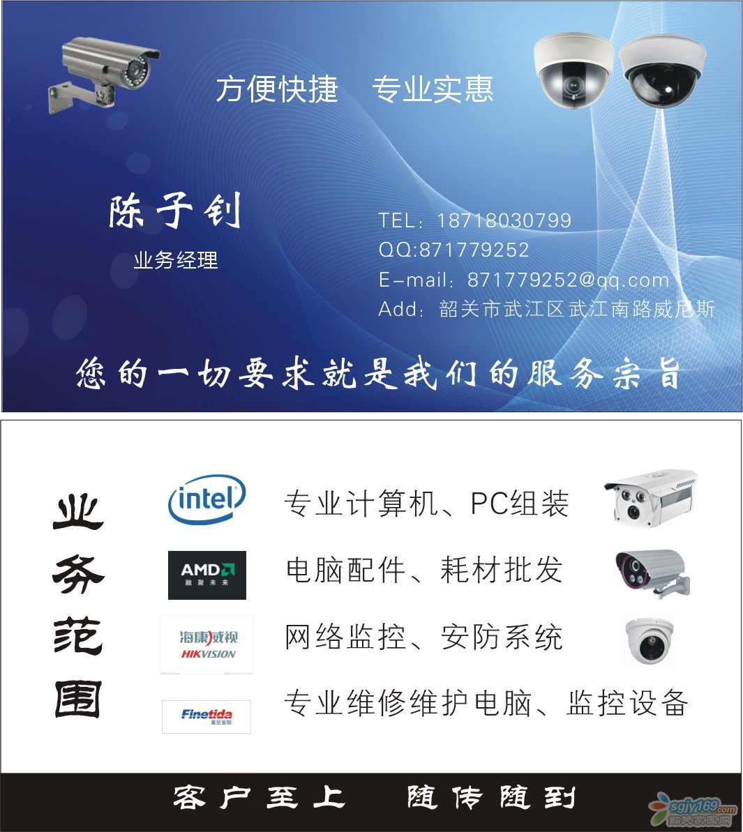 正文摘要:服務(wù)形式:上門維修 服務(wù)口號:客戶至上,隨傳隨到 服務(wù)項目: 上門電腦維修服務(wù),上網(wǎng)故障,電腦慢,死機(jī),更換系統(tǒng),路由器寬帶設(shè)置,無線WIFI安裝,電腦升級組裝,監(jiān)控報裝等等,只需一個電話幫您 ... |